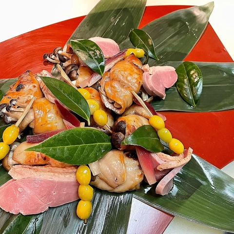 鯛幽庵焼きキノコ挟み焼き、鴨ロース、銀杏串。