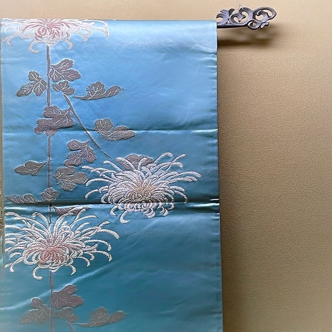 御客様が目に付かれるカウンター上部に昭和の黒留袖をタペストリーに。扇に鶴、お宝づくしの刺繍や染め抜きが施された華やかな意匠を御覧ください。