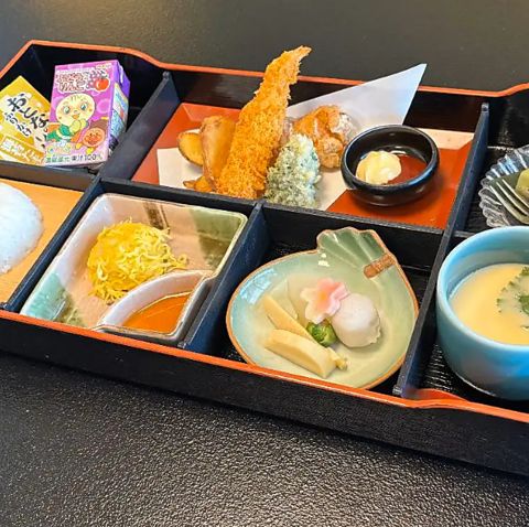 ・手作りいかしゅうまい・鶏の唐揚げ・海老フライ・季節野菜の煮物・茶碗蒸し・おにぎり・デザート・ジュース