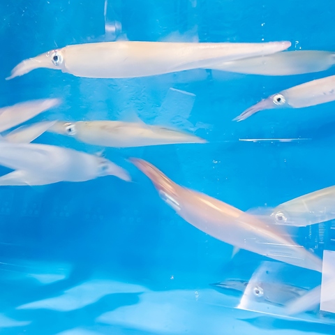 店内中ほどには生簀があり、イカが元気に泳いでいます。