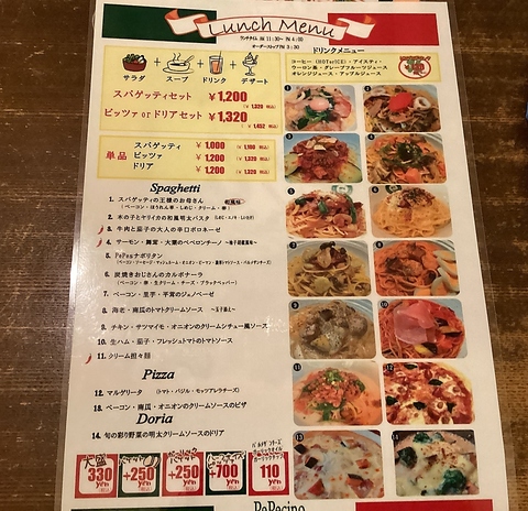 平日ランチ 15種類のパスタ、ピザ、ドリアの中から選べます。11:30ー16:00(os15:30)