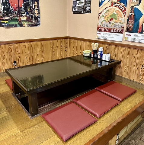 のれんをくぐると広がる開放的なスペースに6名様用テーブルが4卓並びます。掘りごたつ式のテーブル席となり、お寛ぎいただきながらお食事がお楽しみいただけます。