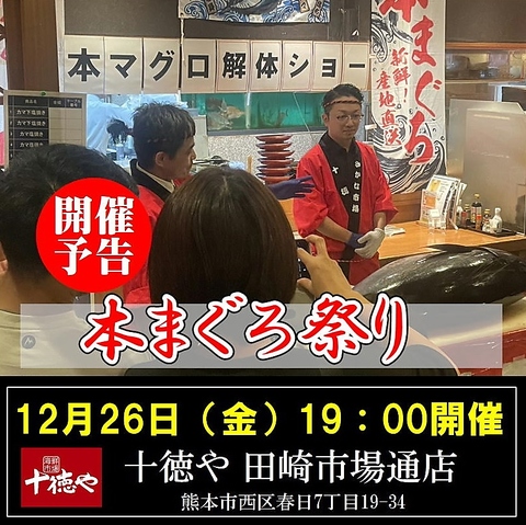 豪快!巨体なまぐろを捌く迫力満点の「生本まぐろ解体ショー」を開催!見て・食べて楽しむ最強のエンターテイメント♪解体当日は希少部位が味わえるメニューの販売もございます。会社の同僚やご友人と、ご家族・お子様も大歓迎!ぜひご来店ください!※12/27(日)~28(月)まぐろ祭り同時開催