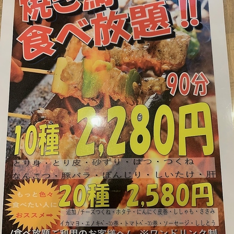 | 食べ放題 | あり :焼き鳥10種、20種食べ放題有り |