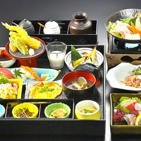 豚バラと鶏の濃厚味噌出汁小鍋をメインに、刺身3種盛りやふぐの西京焼き、海老と旬野菜の天ぷらや冬野菜茶碗蒸し等、接待や会食にぴったりの充実した内容!各種宴会や地域のお集まりにも是非ご利用ください♪※アルコール無しの飲み放題コースも3,700円、お料理のみのコースは2,700円にてご準備いたします。ご相談ください。