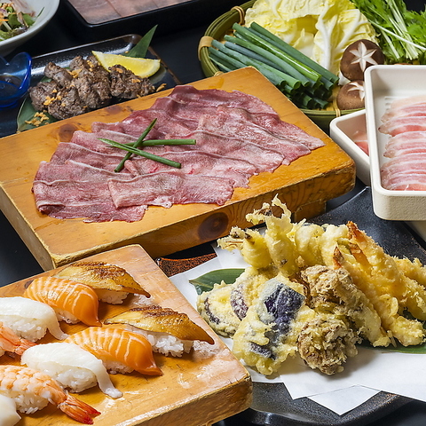 ご予算、食べたい料理にあわせて選べるコースは3種類。豚しゃぶ・寿司・一品料理など、すべて食べ放題。素材にこだわり、食べれば納得の厳選素材。人気のたんしゃぶや天ぷらは桜コースから。豪華★蟹は椿コースで食べ放題!ごゆっくりご堪能下さい♪