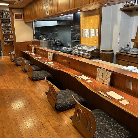 【職人の技を間近で感じられるカウンター】座椅子もあり、足を伸ばしてくつろげるカウンター席も人気です。