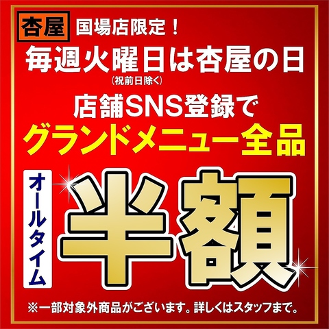 毎週火曜日は杏屋の日!店舗SNS登録でグランドメニューが全品半額!※一部対象外商品がございます。