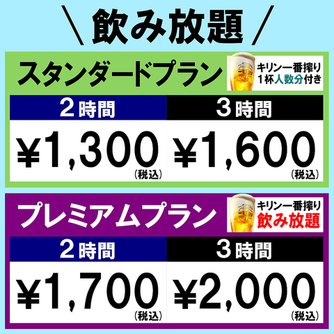 ビール1杯付きのスタンダードプラン、ビール飲み放題のプレミアムプランの2種類をご用意。シーンに合わせてご利用ください!安くお酒飲みたい方必見!!ぜひ【杏屋 国場店】をご利用ください♪