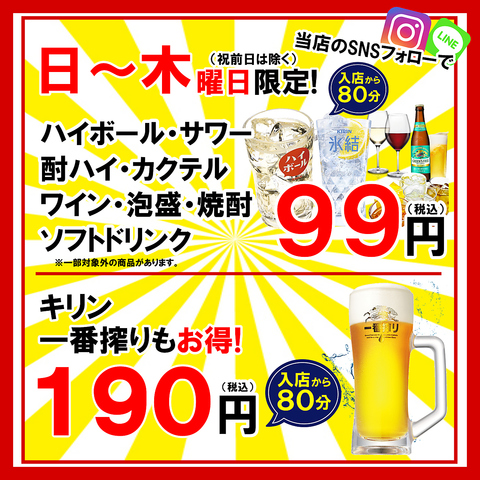 平日限定(祝前日除く)入店から80分は一番搾り190円、サワー・ハイボールが99円!※当店SNSフォロー必須
