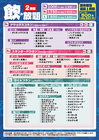 | 飲み放題 | あり :2時間飲み放題ご用意! |