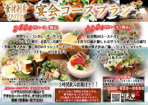 忘新年会コースプラン!!三時間飲み放題込みこみ!!