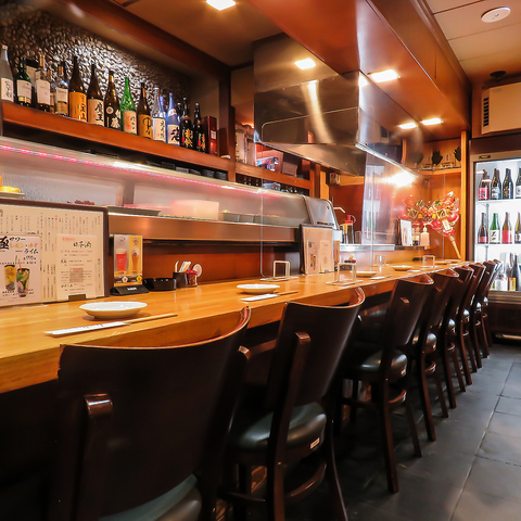【カウンター席】和の趣のある雰囲気抜群のカウンター席はお一人様も大歓迎です。名物料理や自慢の逸品料理に合わせて、厳選した銘酒を是非お愉しみください。※当店に同店名の系列店などはございません。ご予約・ご来店の際は、十分ご注意くださいませ。