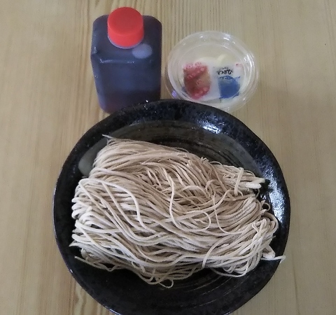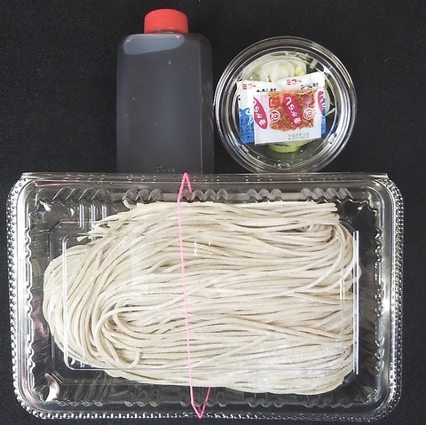 テイクアウト北海道産石臼挽き七三蕎麦になります。機械打ち蕎麦になります。1人前200g・蕎麦汁・ワサビ・七味唐辛子・薬味・揚玉・茹で方のしおり御予約締め切りは、12月30日 火曜日まで