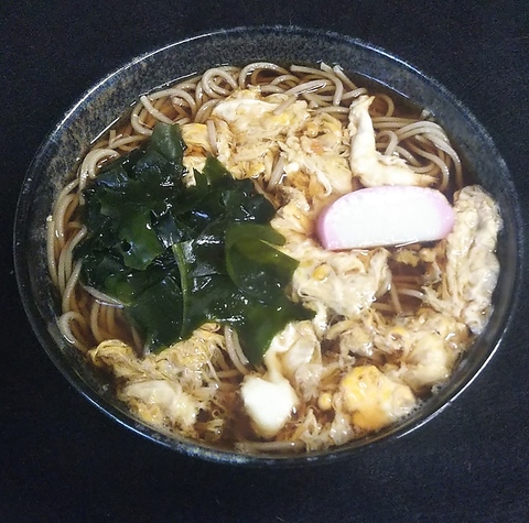 蕎麦は北海道産石臼挽き粉の自家製麺です。わかめ・かまぼこです。七三蕎麦になります。