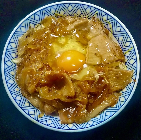 ロース肉です。タマネギとキャベツを入れてます。玉子をのせてます。