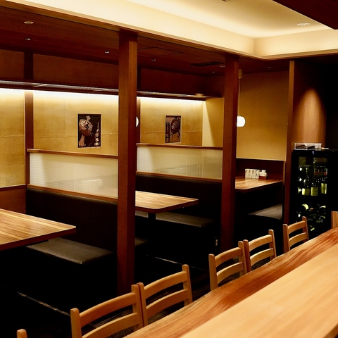 最大4名様までご利用いただける広々としたテーブル席も完備。四季折々の食材を贅沢に使った揚げたての高級串カツを囲みながら、お仲間との食事やご家族との団らん、女子会にも最適な人気のお席です。