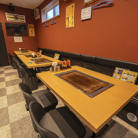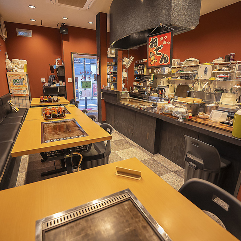 赤みがかった壁と木の質感が調和した和モダンな空間。鉄板付きのテーブルが並ぶ店内は、どこか懐かしさを感じさせながらも洗練された雰囲気。4名掛けのテーブル席はゆったりと配置されており、落ち着いて食事を楽しめます。温かな照明が心を和ませ、居心地の良さも抜群です。