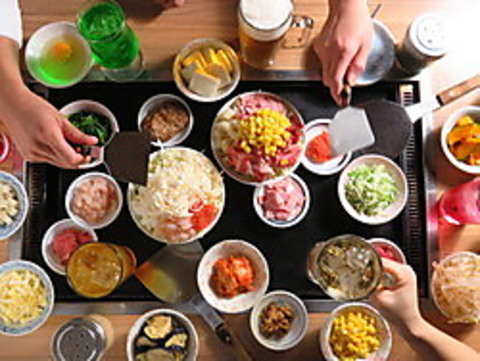 食べ放題メニュー全34種&飲み放題付き3700円(税込)★お好み焼、もんじゃ焼、ごはん、生ビール、サワー!