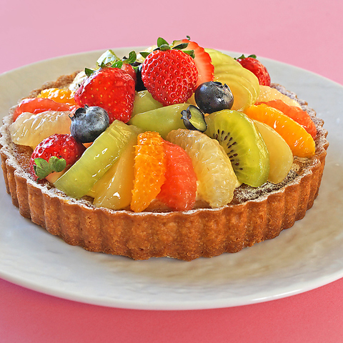 サクサクとしたタルト生地にアーモンドクリームを絞って焼き上げ、コクのあるカスタードクリームの上にたっぷりのフレッシュフルーツを使用したスペシャルタルト。 こぼれるほど彩りよく飾り付けられたフルーツは爽やかな甘さで、見た目も華やかな逸品です。