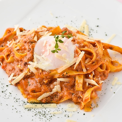 自家製ボロネーゼの中に温泉卵をinして隠し温玉が中に入っています。別の器にしたければお伝え下さい。