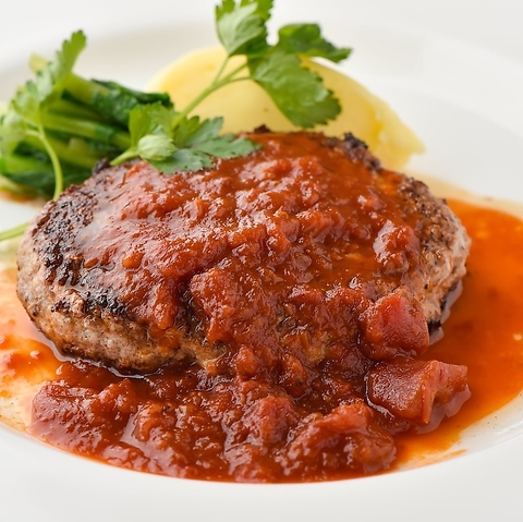 てこねのハンバーグ(肉汁たっぷり!)当店の人気商品です。大人からお子様まで 幅広い層に支持されています!自家製デミソース(+330(税込))・トマトソース・和風ソース3種類のソースからお選び頂けます。