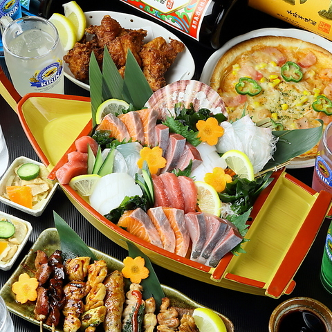 ドーン!!と海鮮舟盛りが登場。炭火焼鳥や鶏の唐揚げなど、ボリュームたっぷり。生ビールも飲み放題でご宴会をどうぞ。飲み放題もプレミアム飲み放題をお付けしておりますので、種類も豊富でご宴会にぴったりです!