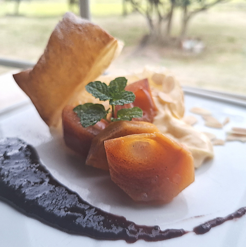 バニラ風味に煮込んだ柿にバニラを効かしたカスタードクリーム、パイと共に