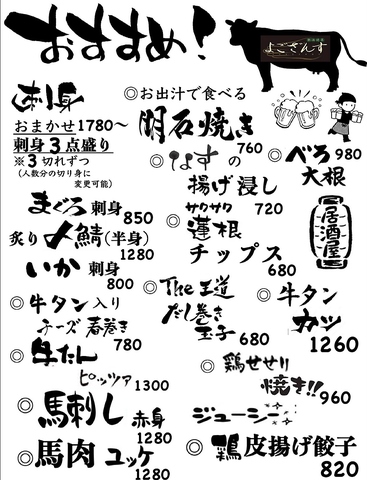 | お酒 | カクテル充実、焼酎充実、日本酒充実 |