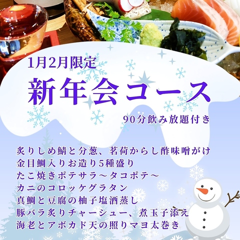 新年のご宴会に最適☆【1月・2月限定!旬の味覚を堪能できるご宴会コース】「金目鯛入りお造り5酒盛り合わせ」や「真鯛と豆腐の柚子塩酒蒸し」、「カニのコロッケグラタン」など旬食材を堪能♪今しか味わえない味覚を楽しみたいご宴会にぴったりな内容となっております!!120分飲み放題付き☆(l.o.90分)