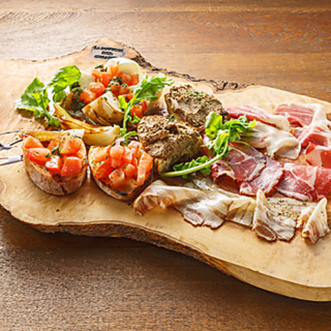 お店で丁寧に仕込む「自家製ハム盛り合わせ」1,380円(税込)は、ワインのお供に欠かせない人気メニューです♪豚バラのパンチェッタや猪モモ肉のチンギアーレなど、珍しい部位もご用意。さらに「窯焼き野菜のマリネ」や「ゼッポリーニ」など、ピッツァを待つ時間も楽しくなる前菜が充実しています。※その時々で内容は異なります。