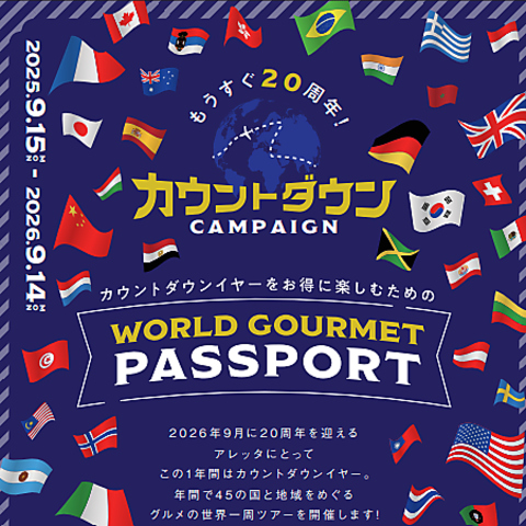 来年の9月で20周年を迎えるアレッタが日頃の感謝を込めて様々なイベントを開催中!ペアで使える200円割引等、お得な特典がもらえるワールドグルメ検定や、5の付く日にポイントが2倍になるGO!アレッタの日など、イベント目白押し!忘新年会プランの予約も受け付け中!毎年大好評ですのでお早目のご予約を!