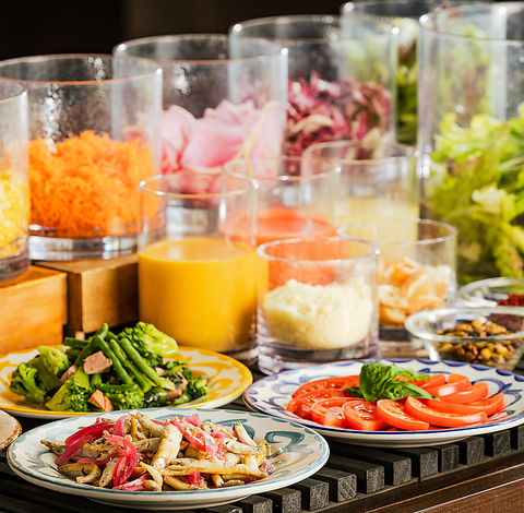 生ハム×サングリアのフリーフロー、色々な苺を楽しめるサルヴァトーレのランチブッフェ!見てもかわいいデザートブッフェ、ショートケーキやタルトはもちろん、モンブランもピンクのストロベリー!変わり種のドレッシングも苺です!新鮮なお野菜がたくさん並ぶ前菜、ピッツァやシェフ特製パスタもあります♪ ※写真は一例