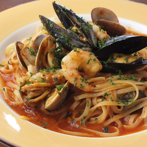 エビ、イカ、ホタテ、アサリを使用した、南イタリアをイメージした魚介のエキスたっぷりのトマトソースのパスタです。本場では、ペスカトーレともいわれています。