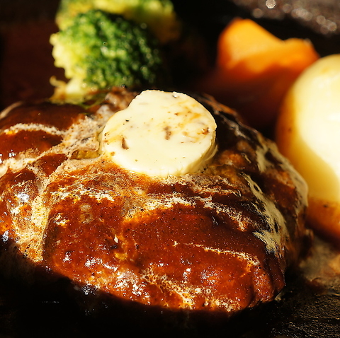 こちらのハンバーグは数量限定で販売させていただいております。那須和牛100%で作った一番人気のハンバーグセット。仕込みの後一日寝かせてから手ごねした牛肉はしっとりしておいしい♪