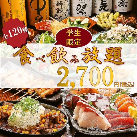 学生必見!日~木限定で、人気の王道メニューが勢ぞろいした全120種の食べ飲み放題が、通常4,500円→なんと27600円!お腹も心も満たされる大満足プランです。定番の居酒屋料理からデザートまで充実のラインナップで、仲間との集まりやサークル飲みに最適。さらに2時間たっぷり楽しめるので、コスパ抜群!