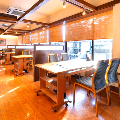 テーブル席は、外を眺めながら楽しめます。木の造りも、落ち着きます。