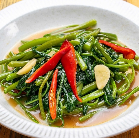 ビタミンたっぷりな空芯菜(くうしんさい)。 シャキシャキの食感を残し強火で一気に炒めます