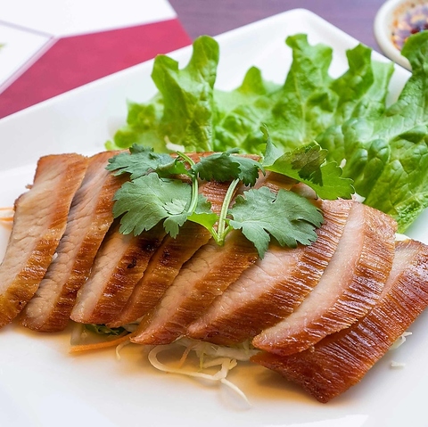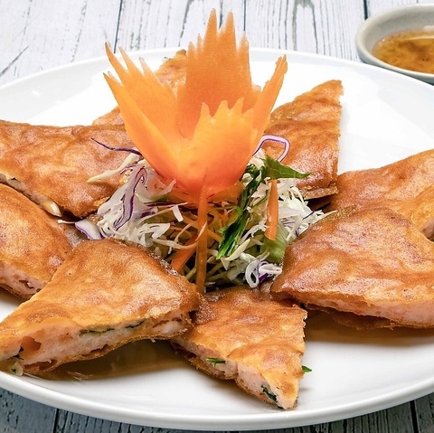 海老のすり身を贅沢に使い、さらにソーセージ、パクチーを春巻きの皮で挟んであげた食べ応えのある一品となっております。