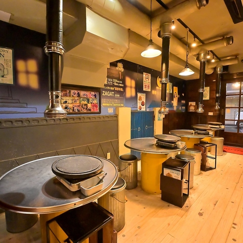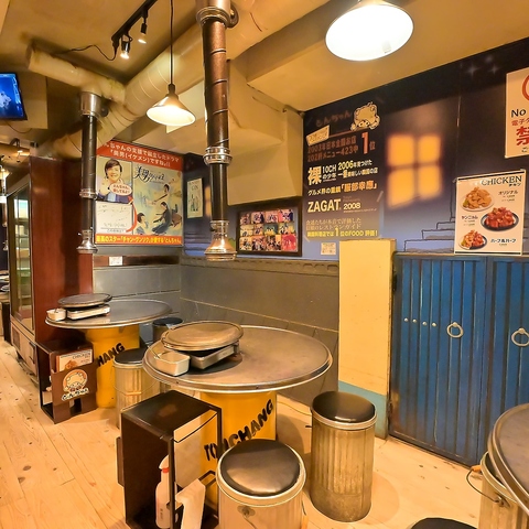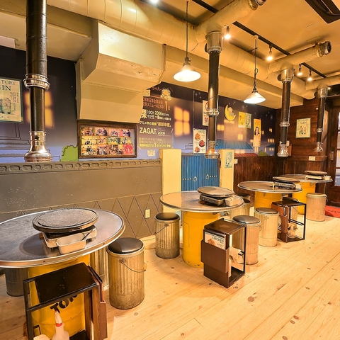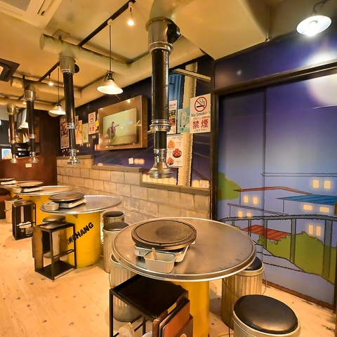 | テーブル | 1名様×1 | 壁に貼られたレトロなポスターや看板が、韓国の路地裏にある名店のような情緒を感じさせます!各テーブルに設置された本格的な石板と、その真上に伸びる排煙ダクトは、美味しいお肉が焼ける期待感を高めてくれます♪仕事帰りの一杯に最適なパワースポットです◎ |