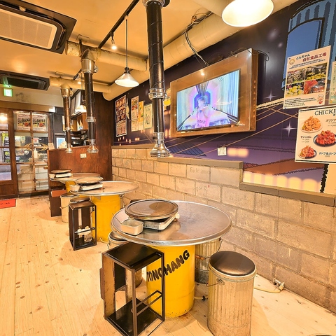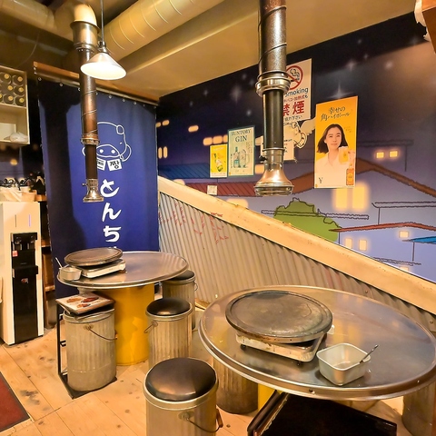 | テーブル | 1名様×1 | 本場韓国の屋台に迷い込んだような、活気あふれる「とんちゃん」の店内。ドラム缶を利用したテーブルや、壁一面に描かれたノスタルジックなイラストが、日常を忘れさせてくれます。排煙ダクト完備で、煙を気にせずサムギョプサルを楽しめるのが嬉しいポイントです★ |