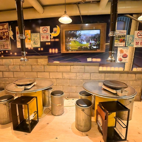 | テーブル | 1名様×1 | 温かみのあるペンダントライトが、ドラム缶テーブルを優しく照らし、賑やかながらも落ち着く空間を作り出しています。広々としたフロアは清潔感があり、女性同士のグループでも安心して楽しめます。本場の熱気とモダンなセンスが融合した、魅力的な一軒です◎ |
