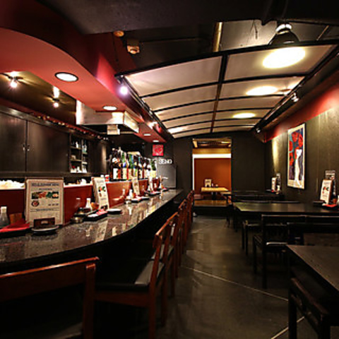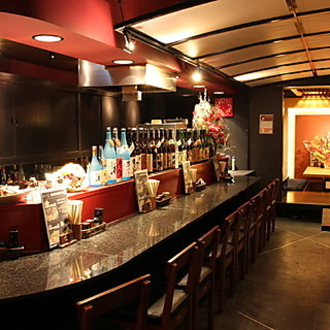 おひとり様大歓迎!人気のカウンター席。落ち着く照明の下で、仲間と語りながら焼酎をどうぞ。居心地の良さに話も弾みます。都会の喧騒を忘れられる落ち着いた店内☆デートや友人とじっくり語り合う等落ち着いた空間★女子会にもぴったりの空間です♪