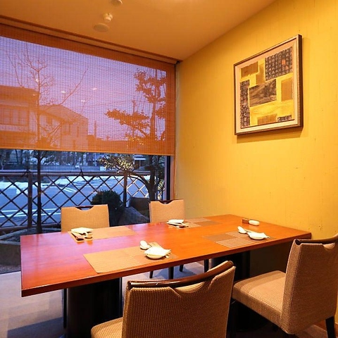 広々としたテーブル席は開放感があり、肩肘張らずお食事をお楽しみいただけます。窓の外には美しい日本庭園が広がり、季節ごとに変わる表情が魅力的。夜になるとイルミネーションが点灯し、幻想的なムードを作り上げてくれます。デートや記念日のお祝いはもちろん、ご家族での普段のお食事にもピッタリです。