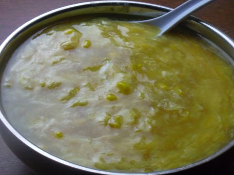 塩ベースのだしに、歯ごたえのよいもろこしがたっぷり。そのうえ卵とじに食べごたえ十分。