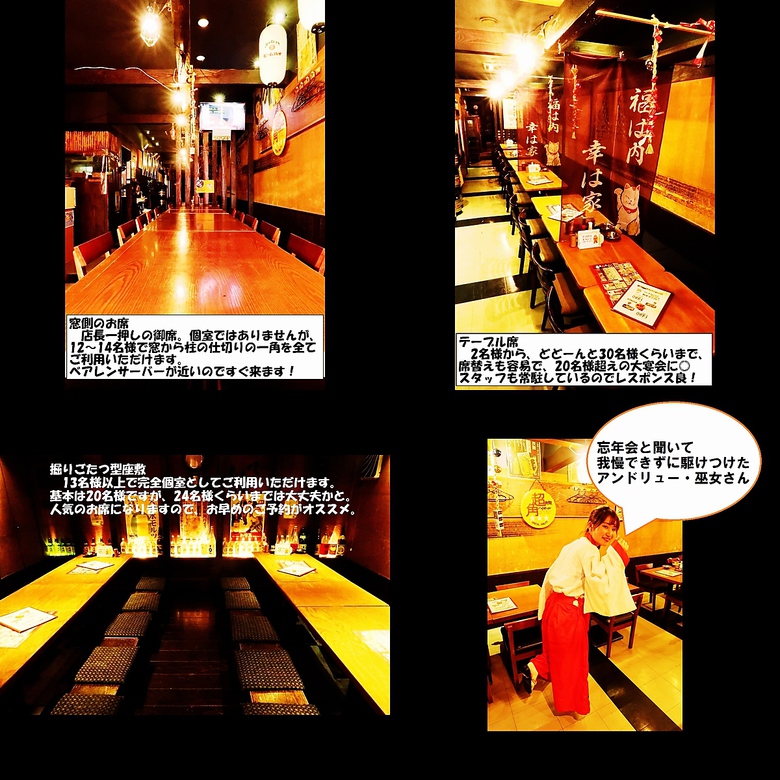 飲み放題付き前日まで要予約、店内貸切30名様以上42名様まで、ご相談ください