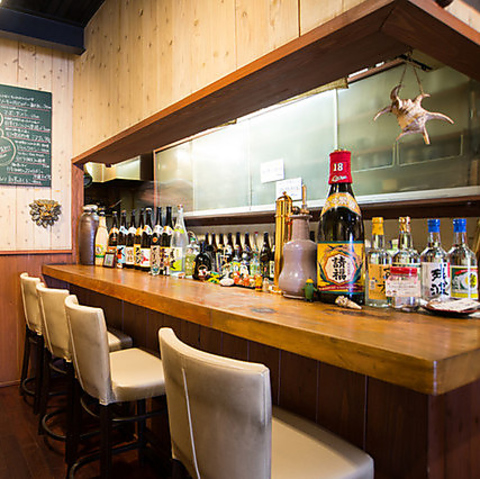 カウンターには泡盛など沖縄ならではのお酒がズラリ!お1人様でもお気軽にどうぞ!
