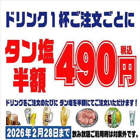 2/28まで、ドリンクを1杯ご注文頂くごとに、タン塩を通常980円⇒480円でのご提供となります!