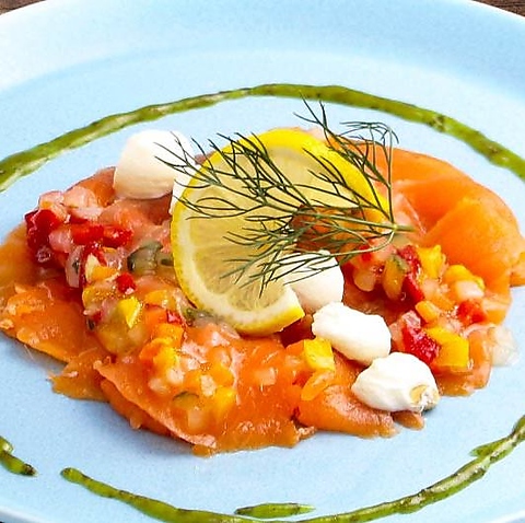 スモークサーモンと彩り豊かな野菜をたっぷり使用したさわやかな一品です。レモンの酸味も程よく、サーモンの旨みを引き立てます。