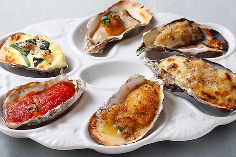 生牡蠣 2個/イクラと白だしジュレのオイスターカクテル 2個/スモークサーモンとアボカドワカモレのオイスターカクテル 2個/ローストビーフとトリュフソースのオイスターカクテル 2個/ウニと牡蠣醤油の焼き牡蠣 2個/トマトガーリックソースと香草の焼き牡蠣 2個/牡蠣のバターソテー 2個/カキフライ2個